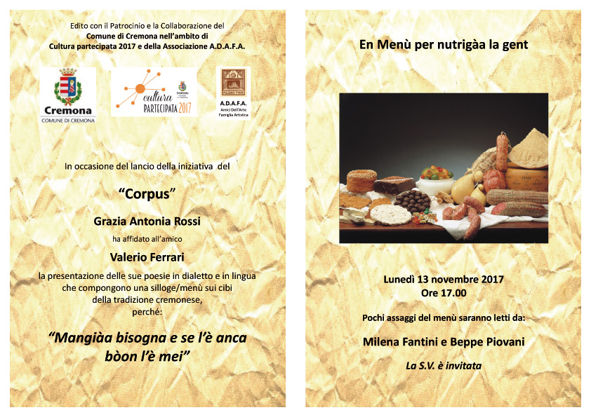 Insieme al progetto del corpus Valerio Ferrari presenterà il volume di poesie Cibi della tradizione. Magnàa bisogna se l’è àan bòon l’è mèj scritto in vernacolo e in lingua da Antonia Grazia Rossi, sui tradizionali cibi cremonesi, inserito nell’ambito del progetto ‘Cultura partecipata 2017’ del Comune di Cremona, a rappresentare l’interesse per il rapporto fecondo tra la cultura dialettale e la cucina tradizionale.