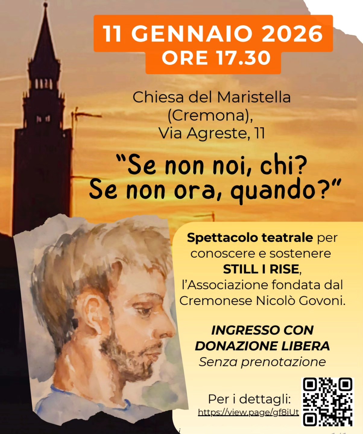 L’11 gennaio 2026 alle 17.30 si terrà lo spettacolo “Se non noi, chi? Se non ora, quando?”, organizzato da Emanuela Ginevra e Katia Gobbi, presso la Chiesa del Maristella di Cremona in via Agreste 11: un evento speciale a sostegno dell’organizzazione non profit Still I Rise e dei suoi progetti per garantire istruzione di eccellenza ai bambini più vulnerabili.