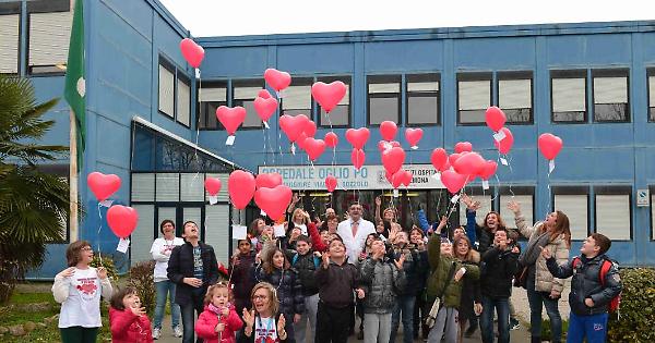 Infine tutti all’ingresso dell’ospedale per il lancio dei palloncini rossi a forma di cuore.