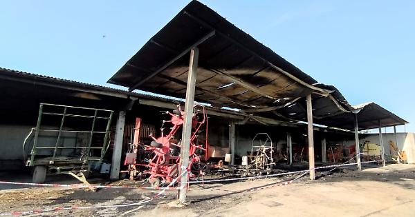 PALAZZO PIGNANO - Danni ingenti all'azienda agricola Poletti di via Turna per l'incendio scoppiato ieri sera, che ha distrutto due trattori, un carro spandiletame e diversi altri macchinari agricoli, oltre a rendere inagibile la tettoia che fungeva da deposito dei mezzi.