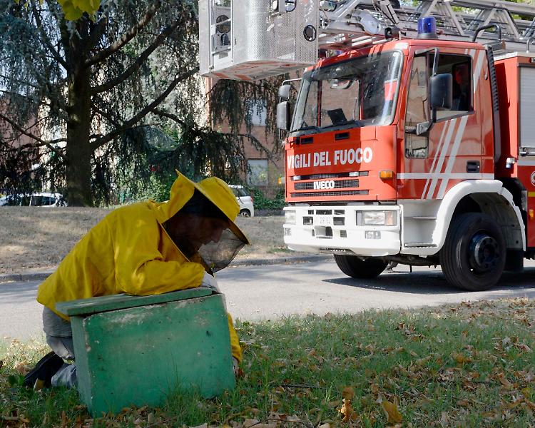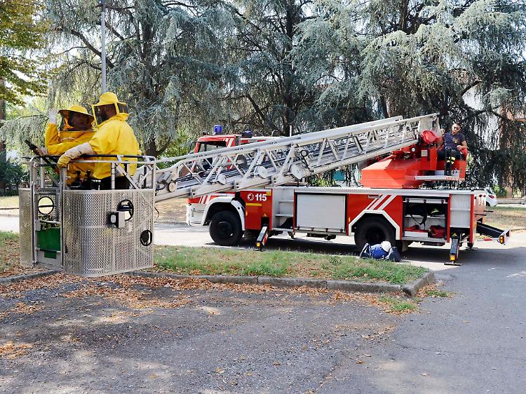 CREMONA -  Intervento dei vigili del fuoco questa mattina intorno alle 10 per la rimozione di un grosso alveare in piazza Bernardino De Lera, alla Villetta.
