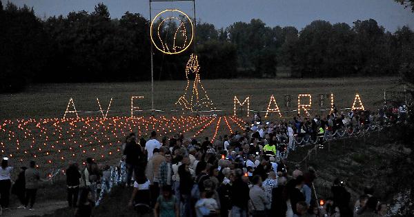 Attorno al fiume, sei enormi fiori illuminati, due campi di lumini rossi e luminarie a disegnare la chiesa su una sponda e l’immagine della Vergine sull’altra. In mezzo alla coreografia suggestiva che ha contraddistinto la manifestazione mariana, la processione fluviale è stata accompagnata dal commento dell’ormai ex parroco don Emilio Luppo e dalla voce della 30enne mezzosoprano Eleonora Filipponi che, assistita dal maestro Mauro Bolzoni, ha elevato canti di lode alla Madonna, interpretando brani di Ennio Morricone e l’Ave Maria.