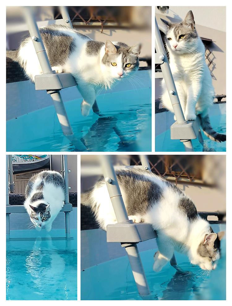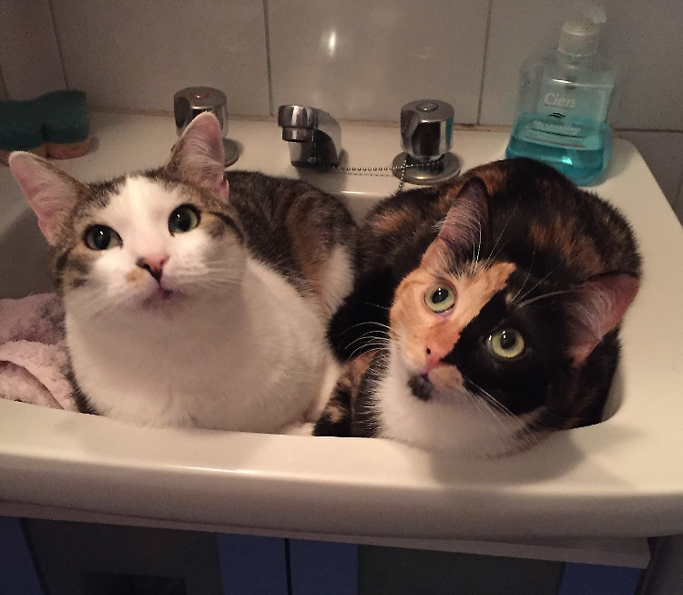 Luna e Fiocco, di Michela Zanetti, si rinfrescano nel lavandino