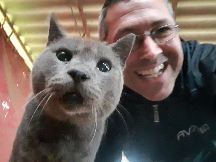 Luciano Amigoni in ferie a Piadena con il suo micione Alisson
