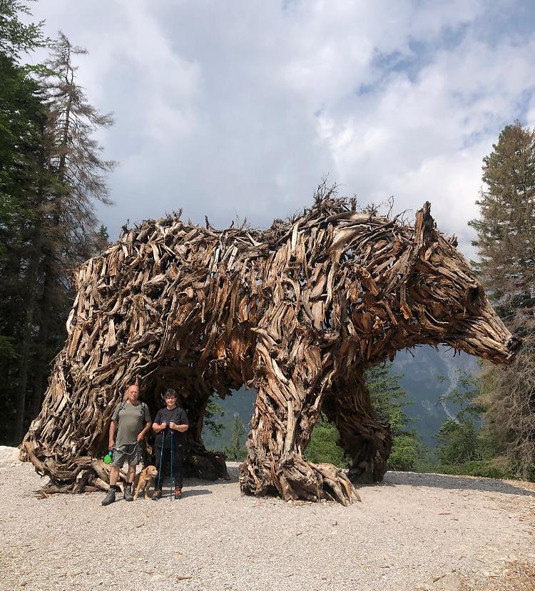 Daniele e Katiuscia col vecchietto Ferdy sotto l’orso del Pradel di Marco Martalar