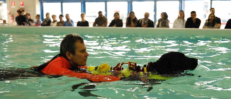 Gli operatori di soccorso si sono gettati in piscina per simulare delle situazioni di pericolo seguiti dai cani che, con un balzo dal trampolino, si precipitavano a raggiungere la persona in difficoltà.