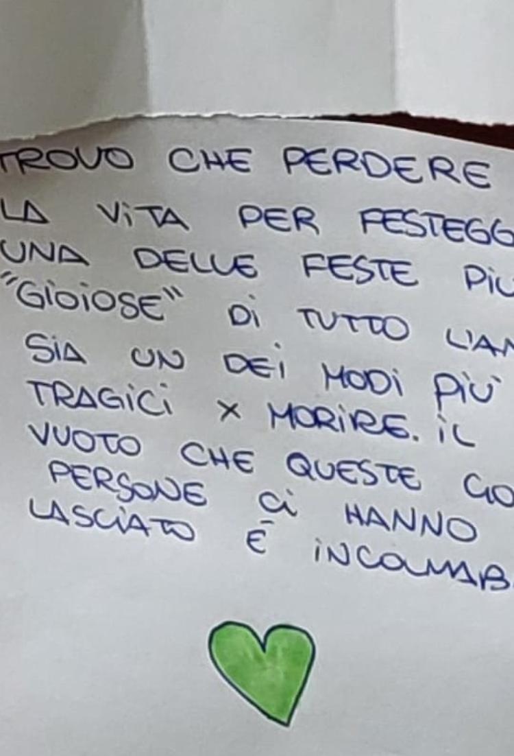 «Di fronte a un tale avvenimento le parole sembrano insufficienti - continua Chiavegato -. Tuttavia sentiamo la necessità di far presente la nostra vicinanza alle famiglie delle vittime, agli amici e a tutte le persone che stanno vivendo il dolore e la sofferenza di una perdita improvvisa ed ingiusta. Nel nostro piccolo, pensiamo che far memoria di chi non c'è più serva a interrogarsi sul valore della vita, sulla fragilità delle nostre certezze e sull'importanza di prenderci cura gli uni degli altri».