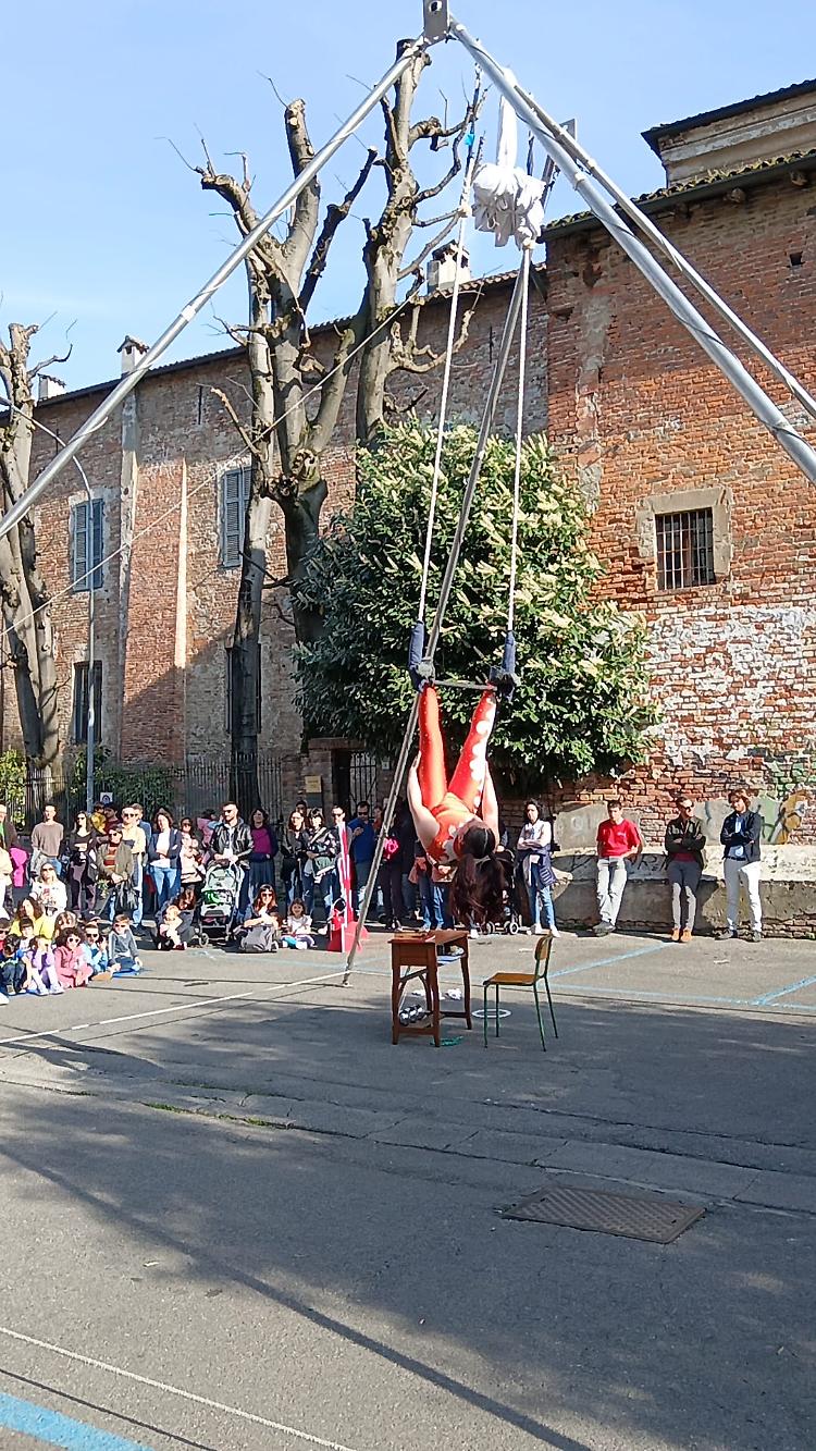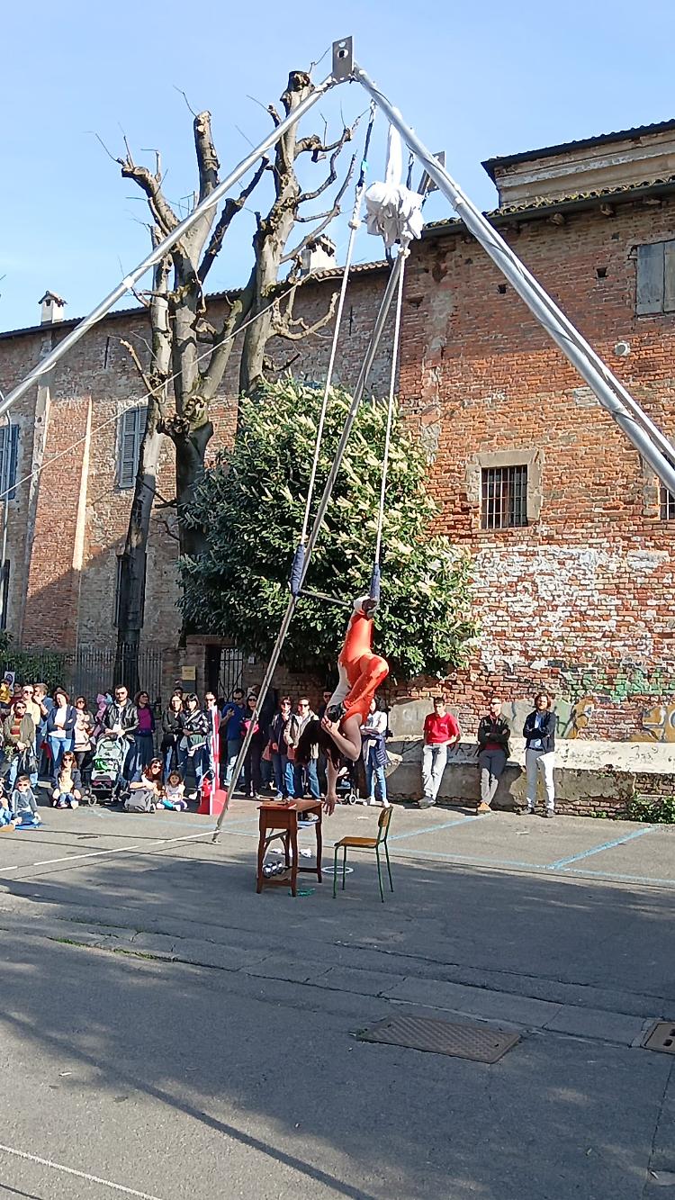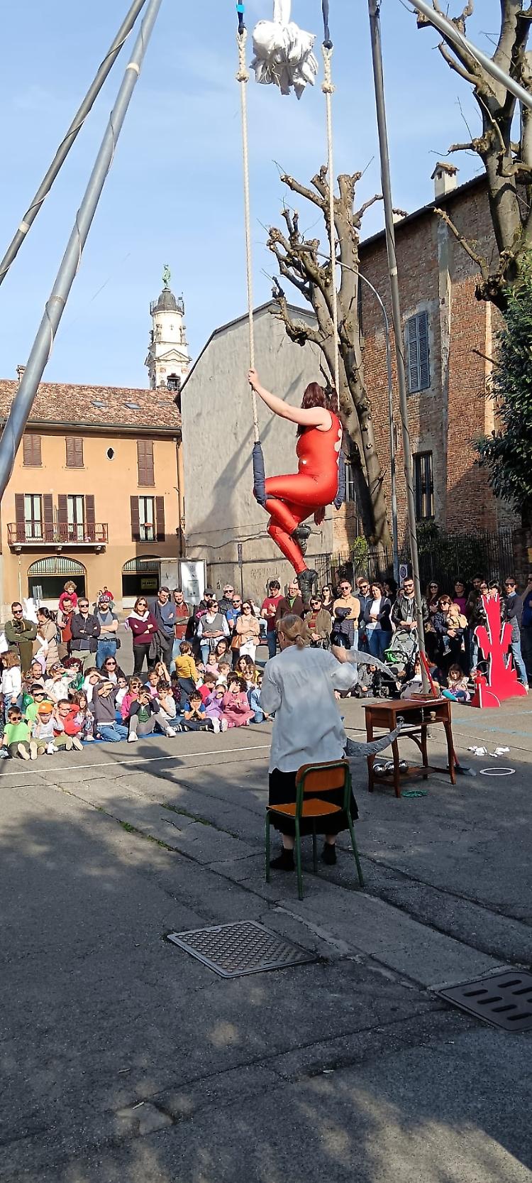 In largo Falcone e Borsellino, sotto un bel sole primaverile, si è tenuto lo spettacolo ‘Circo Rodari’ dello Spazio circo Bergamo, destinato ai bambini dai tre anni.