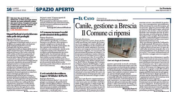 Concludo sostenendo che il canile di Cremona è un servizio per la città e tale deve rimanere. A tal proposito sollecito pubblicamente tutti i sindaci delle varie unioni provinciali sensibili al problema in oggetto affinché prendano posizione in merito.