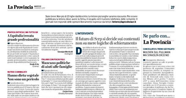 ha destato una certa sorpresa leggere la lettera pubblicata il 10 marzo dal suo giornale con il titolo ‘Lotta alle nutrie persa a causa degli ambientalisti’. Non tanto per il fatto che l’autore non si firmi, indicando un anonimo indirizzo di posta elettronica (cerdella60@gmail.com): del resto non si può pretendere il coraggio di indicare il proprio nome e cognome da chi snocciola una serie di luoghi comuni triti e ritriti, imprecisioni scientifiche, uscite emozionali, giustificazione gratuita dell’illegalità, accanimento contro gli esiti del lavoro della magistratura. A sorprendere è che nel 2017 l’autore (o l’autrice) della lettera possa affermare candidamente «Così altre specie animali autoctone (queste si da difendere e salvaguardare) ci stanno lasciano le penne a causa di uno stupido roditore che porta con se solo danni e nessun beneficio», senza sapere che la nutria ha una dieta esclusivamente vegetale e non minaccia nessun animale presente nell’ecosistema. Uno dei predatori naturali della nutria, accanto alla cicogna, all’airone e al gatto selvatico, è la volpe: un animale sterminato dall’accanimento di un altro animale, questo sì realmente stupido.