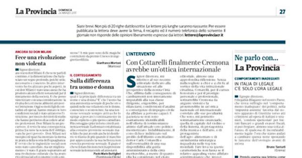 mi riferisco al suo recente editoriale dedicato alla situazione ed alle prospettive della nostra Città. Che, afflitta dalle conseguenze di cambiamenti non interamente imputabili alla sua classe dirigente, esigerebbe, per rilanciarsi, condivisioni d’analisi e convergenze di impegno civile da affidare a persone capaci. E pazienza se non sono esattamente identificabili nell’offerta di testimonianze attinte dall’attuale ceto politico mestierizzato. Indubbiamente, il cono di luce indirizzato sul profilo dell’illustre concittadino dottor Carlo Cottarelli e sull’eventualità di una sua disponibilità alla guida amministrativa della città meriterebbe, a mente di quanto ella ha considerato nel citato editoriale, almeno una approfondita riflessione. Senza nulla togliere a chi è e a chi fu al vertice della vita istituzionale cittadina, Cottarelli, per il cursus honorum e per il prestigio personale e professionale, sottrarrebbe Cremona da anguste visioni e la proietterebbe in un’ottica nazionale ed internazionale correlate alle sue peculiarità. Che sono, mi permetto sommariamente enunciarle, quella di capitale del violino e della liuteria, di protagonista della musica e dell’arte, e di protagonista dell’agro-alimentare e di un’industria siderurgica inquadrata nelle top ten mondiali. Fare leva su queste caratteristiche non basta se il relativo appealing viene affidato a testimonianze che, invece, restano ancorate ad ottiche tutto sommato ristrette ed infeconde. D’altro lato, sul banco degli imputati di aporie non andrebbe solo il ceto dirigente; se poniamo mente alle dinamiche della cosiddetta spending review. Mi riferisco, tra l’altro, alla nomina dell’ottantunenne Enrico Bondi a nuovo commissario per la spending review. E così dopo Giarda,Bondi,Cottarelli,Perotti e Gutgeld rieccoci daccapo.