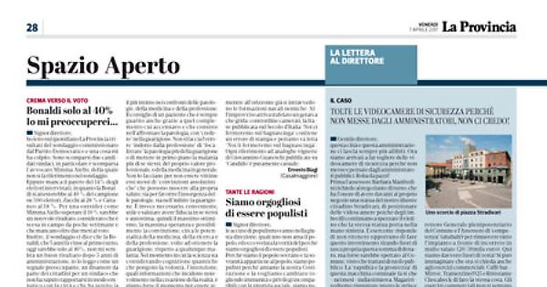 Perché siamo il popolo sovrano e la sovranità appartiene al popolo, siamo populisti perché amiamo la nostra Costituzione e la vogliamo cambiare togliendo immunità e privilegi incompatibili con la giustizia sociale, siamo populisti perché in Italia devono nascere aziende italiane non multinazionali anonime (...) in mano a banche straniere, siamo populisti perché vogliamo tornare a votare e non vogliamo essere governati dalla JP Morgan o dalla Philippe Morris o da Amazon, siamo populisti perché le tasse le devono pagare tutti compresa la Fiat che fattasi grande con il Made in Italy se ne va nei paradisi fiscali e lascia agli italiani il solo onere di pagare le tasse al suo posto (...), siamo populisti e contrari ai processi nefasti di globalizzazione economica che impoveriscono tutti e tutto e arricchiscono la disuguaglianza sociale e ne siamo fieri perché i profughi vanno aiutati nei loro Paesi non mantenuti coi soldi dei cittadini europei (...), siamo stufi delle ruberie e dei camion pieni di merci italiane rubate da vandali che arrivano qui dalle porte aperte dall’UE responsabile di aver rimosso controlli severi ai confini italiani, siamo contro le delocalizzazioni e contro gli industriali italiani che per non pagare le tasse hanno sputato sull’art. 1 della Costituzione e stanno sfruttando cinesi, pakistani, slavi in tutto il mondo (...).