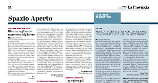 con molto rammarico, devo segnalare un increscioso episodio di cui è stata vittima una nostra socia, affetta da cecità assoluta. La signora si è rivolta a noi per essere tutelata e io ritengo sia giusto riportare qui quanto le è accaduto. Come ci ha riferito, nel pomeriggio di sabato 8 luglio a Cremona, ha avuto necessità di usufruire del servizio taxi per essere accompagnata al proprio domicilio. Purtroppo, per circa due ore, pur contattando i numeri sia delle postazioni fisse che del radiotaxi, non ha ricevuto alcuna risposta telefonica.