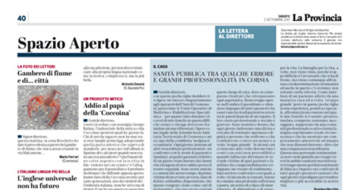 con queste poche righe desidero rivolgere un sincero ringraziamento agli operatori dell’Asst di Cremona – in particolare le Unità Operative di Medicina e Riabilitazione Specialistica – per quanto fatto durante i ricoveri di mio fratello in questa difficile estate e ritengo doveroso formulare alcune riflessioni. Opero come legale nella Azienda Socio Sanitaria Territoriale di Cremona e mi occupo della cosiddetta ‘malpractice sanitaria’.