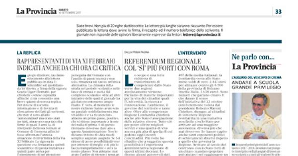 facciamo riferimento alla lettera pubblicata in data 11 settembre sul quotidiano da lei diretto, a firma della signora Grazia Uggeri Bernabè, per chiederle cortese ospitalità affinché ci sia consentito una breve quanto doverosa replica. Per dovere di corretta informazione e di dovizia di elencazione dei fatti gli scriventi, che non si sono affatto ‘autonominati’ ma erano stati invitati, attraverso una raccolta firme di quasi 3 anni fa, di interporre richiesta formale al Comune di Cremona affinché fosse affrontata l’annosa situazione di invivibilità della Via XI Febbraio. La signora in questione era firmataria e quindi sostenitrice di questa iniziativa e quindi parte attiva per l’ottenimento di un’attenzione che, in precedenza, ci sia consentito, non aveva mai avuto effetto concreto alcuno, se non e solo di continue lagnanze.