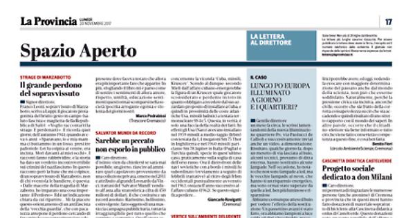 . Abbiamo comunque atteso il buio per vedere l’effetto della sostituzione. Un passettino avanti è stato fatto, ora abbiamo lampioni a luce calda ed altri a luce fredda, ma comunque la via resta ancora abbastanza buia. Di sicuro, se il responsabile dell’azienda elettrica passasse da noi di sera, rientrato in sede, non potrà che dire ai suoi collaboratori «abbiamo scambiato un asino con una capra». Nel frattempo, via Al Porto, il lungo Po Europa, sono illuminati a led come fosse giorno. E si sa, in questo periodo, noi cremonesi andiamo tutti sulle rive del Po di notte. Non era forse più opportuno sistemare prima le vie nei quartieri e poi la zona adiacente il fiume? E’ vero che il nostro sindaco ha parlato di un risparmio energetico del 60%... ma a discapito della mia via e forse di altre?