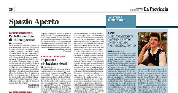 «Vengo da Cremona, siete il 22º negozio che visito, non ne posso più, ma per mio figlio autistico sono pronto a fare il giro d’Italia. Se potete aiutarmi, farete felice con me, un ragazzino che ha il sorriso più bello del mondo!». Le signore non perdono un secondo, mi chiedono il nome e il numero di telefono, mi assicurano che faranno il possibile, a loro prometto che tornerò da Cremona, in fondo Cremona non è poi così lontana. stanco e frustrato esco dal negozio riprendo il furgone e col magone in gola, scrivo a Giulio: «Lo stiamo cercando in tanti, anche Babbo Natale!».