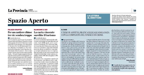 mi spiace che la Sindaca di Crema in virtù di un ‘progressismo di facciata’ con il suo atto abbia sdoganato una odiosa pratica di sfruttamento delle donne. Una pratica che è anche un reato: in Italia l’utero in affitto è vietato dalla legge. Una pratica che rappresenta una atroce forma di schiavismo che viene passato per ‘amore’. Mi spiace che con la sua decisione di trascrivere all’anagrafe del comune due papà per due gemellini abbia, nei fatti, umanizzato la compravendita di neonati su ordinazione avallando la pratica della maternità surrogata. Ma siamo veramente consapevoli di cosa ci stia dietro la maternità surrogata: un enorme traffico di interessi economici, che non risponde all’umanamente comprensibile desiderio di avere figli, ma alla richiesta di mercato di ricchi capricciosi. Etero o gay che siano. Basterebbe scorrere la lunga lista di vip (di ogni orientamento sessuale) che si sono procurati uno o più figli da madri surrogate per capire di cosa si stia parlando: in genere si tratta di donne in difficoltà economica. Che non vivono solo nel Sud Est asiatico, come pretendono di far credere coloro che indicano Stati Uniti o Canada come Paesi in cui la surroga avviene per spiccata modernità. Raramente i profili delle madri surrogate assurgono alle cronache, ma quando capita si scopre che si parla sempre di ragazze giovanissime, già madri di altri figli, magari single e con un lavoro modesto o ai margini della società. Notizie di casalinghe facoltose o di avvocatesse in carriera che hanno affittato l’utero, invece, non sono mai pervenute. Chissà perché! Di fatto, si paga una donna per confezionare un prodotto-bambino. Non si tratta di altruismo né di dono, come sostengono i sostenitori di questa nuova modernità: far credere che le donne si mettano generosamente e gratuitamente a disposizione di sconosciuti, con grave pregiudizio per la propria salute fisica e psichica, è offensivo per loro stesse e ci fa tornare, questo si, ai tempi bui del fascismo quando il genere femminile era considerato solo una macchina di riproduzione o come dice la Sindaca stessa, in palese dissonanza con il suo agire, una ‘fabbricante di figli’.