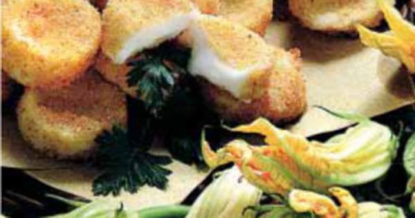 Ingredienti (per 4 persone): 400 gr. di mozzarella, 16 fiori di zucca, 90 gr. di farina, 1/2 l. di latte, 3 uova intere, 2 albumi, 40 gr. di pangrattato, 3 dl di olio di semi, sale.