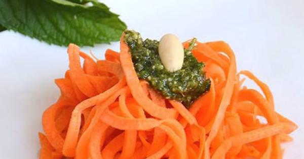 Lavare bene le foglie di menta, asciugarle e metterle nel mixer con mandorle, formaggio, aglio, sale e olio, e frullare. Condire gli spaghetti di carote alla menta e servire subito.