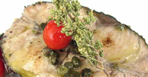 Ingredienti (per 4 persone): 4 filetti di aguglia imperiale da circa 200 gr cad., 350 gr di pomodorini ciliegino,1 limone (di tipo Verdello), 4 spicchi di aglio, 2 cucchiai di capperi, 1 mazzetto di origano secco, 1 cucchiaio di peperoncino in polvere,