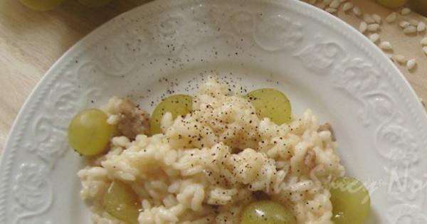 Ingredienti (per 4 persone): 1 cipolla piccola, 320 gr di riso (preferire il Carnaroli), 240 gr di salsiccia di maiale classica, una ventina di chicchi d'uva bianca (più qualcuno per decorare), mezzo bicchiere di vino bianco, brodo di carne, un cucchiaino di prezzemolo tritato (facoltativo), 1 cucchiaio di olio extravergine di oliva, 2 cucchiai di Grana Padano grattugiato.