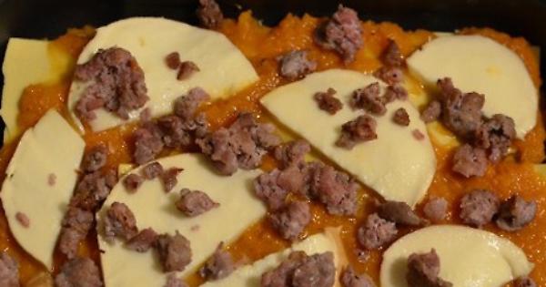 Ingredienti: 3 salsicce, 800 gr. di zucca, sfoglie per lasagne, latte, farina, burro, fior di latte.