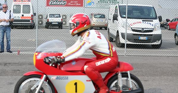 SAN MARTINO DEL LAGO - La sessione di prove libere organizzata martedì 9 settembre dal Motoclub Torrazzo per i soci al circuito San Martino del Lago si è trasformata in una festa grazie alla presenza di Giacomo Agostini. Il 15 volte campione del mondo, accompagnato dalla moglie e dal figlio Giacomino, ha monopolizzato l’attenzione generale con la mitica Mv Agusta 500 numero 1 e con una fiammante Mv Agusta F3 Ago, la motocicletta firmata dal centauro.