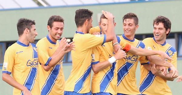 Mario Scietti festeggiato dai compagni dopo il gol all'Atalanta