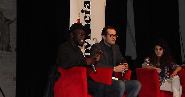 CREMA — «Ho cominciato a scrivere come rivalsa verso la mamma della mia ragazza che non mi accettava più per il fatto che ero cresciuto in una casa popolare che per il colore della mia pelle, ho continuato per rivalsa verso che è discriminato per i motivi più vari: perché ha la pelle di un colore diverso, perché non è ancora qualcuno nella vita o nella carriera, perché non ha cittadinanza in questo paese». Antonio Dikele Distefano, il 22enne ‘caso letterario’ di queste settimane con il suo libro ‘Fuori piove, dentro pure, passo a prenderti?’ (prima star sul web come autoprodotto, adesso 10mila copie cartacee volatilizzate in pochi giorni e ristampa già in circolazione), invitato da una giovanissima lettrice di Crema, ha scelto il Caffé Letterario per la sua prima uscita ufficiale come autore Mondadori. E lo ha fatto anche per fare di ‘chioccia’, assieme ad un altro scrittore in erba ma già affermato, Giorgio Ghiotti, 20enne vincitore del Campiello Giovani Lazio che, appena 17enne, aveva già firmato la raccolta di racconti ‘Dio giocava a pallone’ (pubblicato da Nottetempo), al gruppo dei giovanissimi finalisti del concorso di scrittura ‘Nutrire il corpo nutrire l’anima’ organizzato dal Franco Agostino teatro Festival e dal Comitato Soci Coop di Crema in collaborazione con lo stesso Caffè Letterario. E’ stata una frizzantissima serata under 25, iniziata con la premiazione dei vincitori coordinata da Valentina Cipriani. Distefano e Ghiotti, in una lunga chiacchierata seguita dal foltissimo pubblico (circa duecento persone: sul palco, luogo tradizionale di incontri del Caffè Letterario non c’era posto per tutti e si sono accomodate in platea), hanno parlato della storia d’amore e di riscatto narrata nel romanzo del primo, hanno concentrato a lungo l’attenzione sul lavoro dei loro giovanissimi ‘colleghi’ del concorso di scrittura, prodigandosi in consigli: «Fondamentale la lettura, molta lettura», hanno concordato. La storia raccontata da Distefano è una vicenda d’amore e di razzismo che ha visto la luce perché «mio padre sotto il cuscino ci metteva i libri, non i soldi: è stata la mia fortuna». Poi l’invito a non mollare e ad «alzare la testa guardandosi in giro. Sapendo che anche fallire è importante: solo chi è libero può permettersi di fallire per poi risollevarsi». Distefano il ‘rifiutato’ ora ha pubblicato un libro con il quale spera addirittura di superare Fabio Volo, «quello che vende più libri di tutti». E’ italiano di seconda generazione, nato a Busto Arsizio figlio di migranti angolani: «La mia è una storia di riscatto, ma non voglio essere etichettato come lo scrittore nero e basta. Voglio fare capire che in Italia i ragazzi di colore non sanno solo giocare a pallone, ma anche amare, scrivere e pensare».