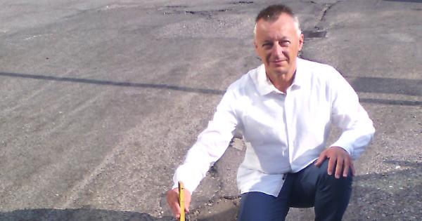 Giuseppe Sbarufatti 'misura' una buca in viale De Gasperi