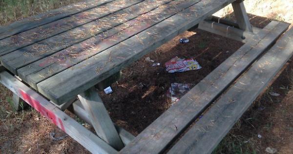 Uno dei tavoli imbrattati e circondati da cartacce e rifiuti
