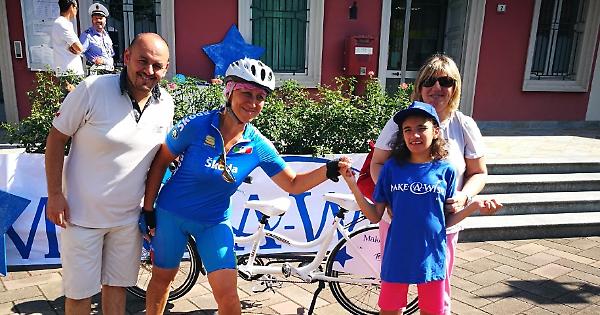 CREMOSANO - Tutti in bici con Aurora. Era il ritratto della felicità sabato 9 giugno la giovane Aurora Scannella, dodicenne di Cremosano affetta dalla sindrome di Rett, quando, aiutata da mamma Eleonora e da papà Giuseppe, è salita per la prima volta sulla hugbike donatale dall’associazione 'Make a wish' (una non-profit con sede a Genova ed ufficio a Milano che realizza i desideri di bambini e ragazzi di età compresa tra i 3 e i 17 anni affetti da gravi patologie per portare loro forza e speranza) nel contesto di una cerimonia pubblica che si è tenuta in piazza Garibaldi su iniziativa del Comune, dell’associazione Il Caleidoscopio-famiglie ed accoglienza e dell’oratorio. L’hugbike, detta anche bici degli abbracci, è uno speciale tandem che viene guidato dalla persona che siede dietro mentre quella che siede davanti è come se fosse abbracciata dal vero conducente. Testimonial dell’evento Patrizia Spadaccini, ciclista cremasca vincitrice di due medaglie d’oro alle paralimpiadi di Atlanta ’96 con l’atleta non vedente Daniele Costa.