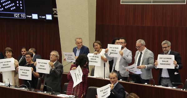 MILANO - «Giù le mani dalle periferie». E’ questa la scritta sui cartelli che i consiglieri regionali del Pd hanno innalzato in aula oggi dopo il question time dedicato al Bando periferie con il quale si chiedeva al presidente Attilio Fontana un intervento diretto nei confronti del Parlamento e del governo.