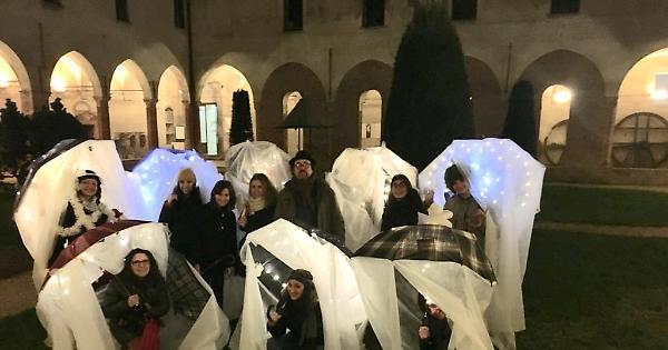 CREMA - Se non c’è meraviglia, non c’è conoscenza del mondo. Con questa consapevolezza, l’artista internazionale Antonio Catalano ha regalato alla città la sua magia, nell’Invasione dei cortesi, performance realizzata in piazza Duomo a Crema domenica 9 dicembre, insieme a una decina di insegnanti di Crema, Carpiano (Milano) e Pavia, che hanno partecipato al laboratorio da lui condotto nella giornata di sabato 8 dicembre, nella saletta Fra’ Agostino del museo civico. Sotto grandi ombrelli-universo, Catalano ha condotto il gruppo e gli spettatori in un viaggio che è stato dono di sé agli altri, delle proprie emozioni e dei ricordi legati al Natale e all’esperienza personale di ciascuno. Ombrelli telati e avvolgenti, come piccole tane in cui è necessario entrare per scoprirne la meraviglia. Un’arte rinascimentale riportata nel cuore della città ai nostri giorni: fragilità, sensibilità, ascolto del silenzio e di quel che si può sussurrare o non dire ma far capire. Una sorta di sospensione del tempo materiale, per lasciare spazio a quello dell’anima. Ogni partecipante ha costruito il suo piccolo mondo, da regalare a chi ha ospitato sotto il suo ombrello-universo. E la città ha risposto con entusiasmo, lasciandosi emozionare da gesti di cortesia.