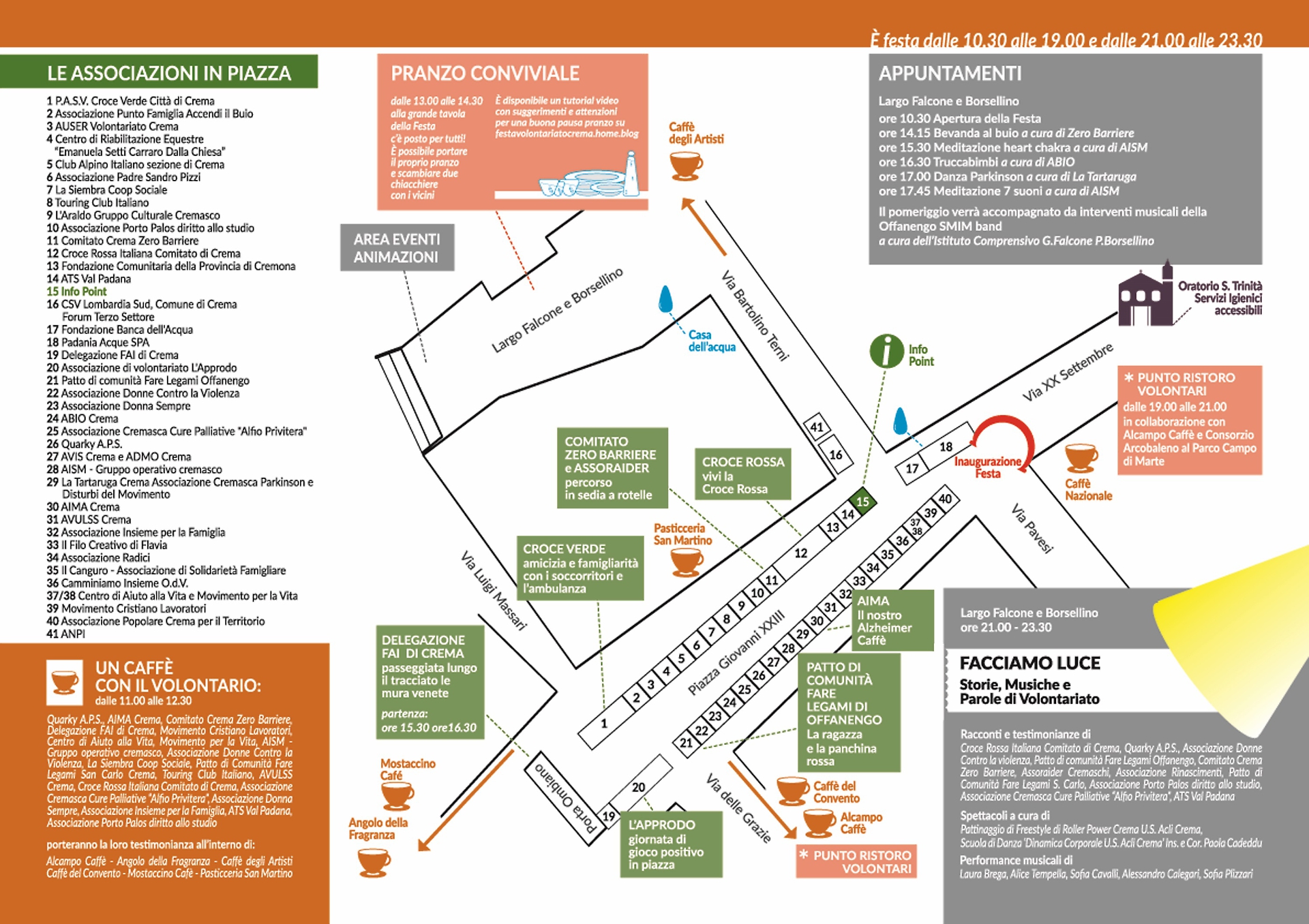 La festa di giorno e di sera - La giornata del 29 settembre sarà idealmente suddivisa in due fasi: dalle 10.30 alle 19.00 in piazza si troveranno gli stand delle organizzazioni affiancati da un ricco programma di eventi e animazioni. Alla sera, invece, dalle 21.00 alle 23.30 si svolgerà “Facciamo luce”, un appuntamento rivolto in modo particolare ai giovani con storie, musica e parole del volontariato, in cui i racconti e le testimonianze delle associazioni si alterneranno con gli spettacoli di danza e pattinaggio e con le performance musicali di giovani artisti cremaschi: Laura Brega, Alice Tempella, Sofia Cavalli, Alessandro Calegari, Sofia Plizzati.