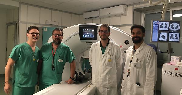 CREMA (27 dicembre 2019) - Centrare il bersaglio senza sbagliare nemmeno di un millimetro è fondamentale quando si effettua un biopsia – in questo caso il prelievo di cellule per effettuare una diagnosi su noduli del polmone, reni e fegato e retroperitoneali – in aree critiche, vicino ad organi nobili come il midollo, le radici nervose e i vasi arteriosi. Grazie alla nuova tecnologia in dotazione allo staff di Radiologia interventistica dell’ospedale Maggiore, tutto questo è ora possibile anche a Crema. «La nuova apparecchiatura Tac (Tomografia assiale computerizzata, ndr) – spiega il primario Gianpaolo Benelli – che abbiamo in dotazione si caratterizza per un sistema di massima precisione, denominato «Fluoro tc», per eseguire manovre diagnostiche e terapeutiche su lesioni nel distretto toraco – addominale». I vantaggi riguardano appunto l’obiettivo dell’intervento.