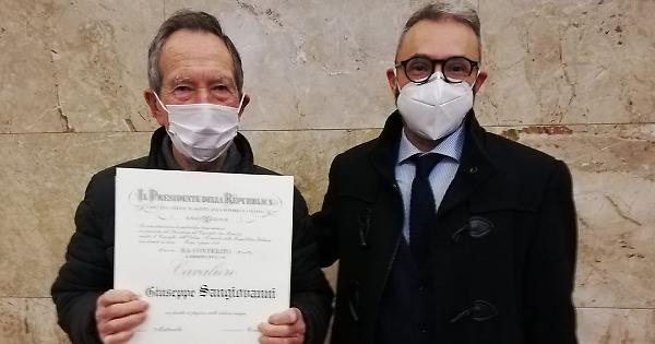 CAPRALBA (13 dicembre 2020) - «Per l'impegno civile e l’attività di volontariato svolti con umiltà e con totale disinteresse personale». È questa la motivazione con cui Giuseppe Sangiovanni, per tutti Pino, è stato insignito dal presidente Sergio Mattarella del titolo di «Cavaliere dell'Ordine al Merito della Repubblica Italiana».  Un riconoscimento che premia l’ottantunenne Sangiovanni per una vita spesa al servizio della comunità locale in qualità di amministratore comunale e soprattutto di volontario. Il sindaco capralbese Damiano Cattaneo ha accompagnato Pino a Cremona, in prefettura, dove i due hanno ritirato l’attestato ed una lettera di congratulazioni del prefetto Vito Danilo Gagliardi al neo-cavaliere.