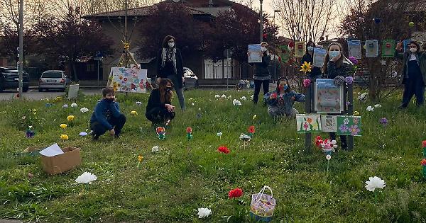 AGNADELLO (23 aprile 2021) - Fiori, disegni e cartelloni per arricchire un luogo destinato al ricordo di chi non c’è più a causa della pandemia e per dare un segnale di speranza e di voglia di rinascita. È il progetto Crea un fiore per il giardino della speranza che, su iniziativa dell’associazione Amici per la scuola in collaborazione con i plessi agnadellesi dell’istituto comprensivo Eugenio Calvi di Rivolta, ha visto il coinvolgimento di bambini e ragazzi delle scuole materna, elementare e media chiamati, con l’ausilio degli insegnanti, a dare sfoggio di creatività. Bambini e ragazzi, non solo in presenza in aula ma anche da casa durate il periodo della didattica a distanza, hanno realizzato chi fiori di carta, chi cartelloni e disegni chi composizioni ispirate alla natura che mercoledì sera l’associazione Amici per la scuola ha installato nell’aiola centrale di piazzetta Dello Studente, lo spazio pubblico antistante la scuola elementare che da ieri mattina e per qualche giorno (poi l’installazione verrà smontata per ragioni di tutela ambientale) offrono un colpo d’occhio particolare. Nell’aiuola stanno crescendo i due alberi messi a dimora per volontà del Comune e delle associazioni locali lo scorso 18 marzo, in occasione della giornata nazionale in ricordo delle vittime del Coronavirus. «Avremmo dovuto realizzare il progetto — spiega Marta Tagliaferro, presidente di Amici per la scuola — proprio in occasione di quella giornata ma la Lombardia era in zona rossa e quindi abbiamo deciso di rinviare il tutto. Noi mamme dell’associazione abbiamo allestito l’aiola nel tardo pomeriggio di mercoledì, con l’aiuto anche di qualche bambino. Scopo del progetto è dare un segnale di rinascita».