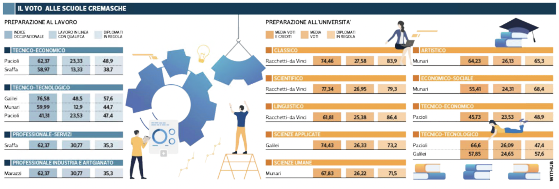 CREMA - L’istituto Galilei è la scuola che prepara meglio gli studenti all’inserimento nel mondo del lavoro, mentre il liceo Racchetti-da Vinci vanta i dati più lusinghieri per quanto concerne coloro che scelgono di andare all’università. Ad affermarlo, numeri alla mano, è il portale Eduscopio.it della Fondazione Agnelli (www.eduscopio.it), che presenta ogni anno i dati aggiornati sulle scuole superiori che meglio preparano agli studi universitari o alla ricerca di un impiego dopo il diploma. Si propone di aiutare gli studenti e le loro famiglie nella scelta del percorso di studi dopo la terza media, offrendo informazioni sui vari istituti.