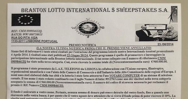 La notifica - che viene specificato essere «l’ultima prima che il premio venga annullato» - invita il destinatario ad attivarsi subito per ricevere la somma prospettata. Come? Versando il 10% della vincita alla società che gestisce il concorso. L’importo coprirebbe le spese necessarie a sbrigare tutte le pratiche, dunque tasse, imposte, commissioni bancarie, costi di trasferimento e assicurazioni varie.
