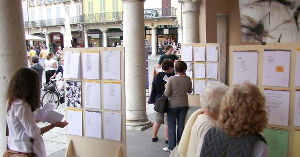 CREMA - Cinquantotto autori-espositori per un totale di 148 testi e 35 poeti presenti agli eventi. Sono questi i numeri della 19ª edizione di Poesia a Strappo intitolata ‘Saldi’, in programma sabato 6 e domenica 7 in piazza Duomo, sotto la regia del circolo poetico Correnti. Oltre all’esposizione di testi che il lettore potrà ‘strappare’ per confezionare la propria personale antologia, sono previsti numerosi eventi collaterali. Oggi alle 17, si tiene ‘Sakura: la natura non fa i saldi’, azione mimica e poetica di Stefania Carcupino. A seguire verrà presentato ‘Assalto ai saldi, poetry parade’, con i poeti Sebastiano Adernò, Annamaria Giannini, Vera Libertà e Nino Iacovella e la fotografa Donatella D'Angelo. Subito dopo ci sarà ‘Cronache della città parallela reload’, gesto e voce di Alessandro Assiri. Alle 18, reading dei poeti Renato Sclaunich, Angelo Magro, Ferruccio Brugnaro, Cristina Tomedi, Francesco Casuscelli, Beppe Ratti e Giovanni Uggeri.