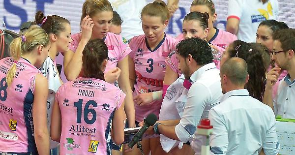 Il tecnico Mazzanti dà le indicazioni alla squadra: stasera la Pomì è chiamata ad una grande impresa