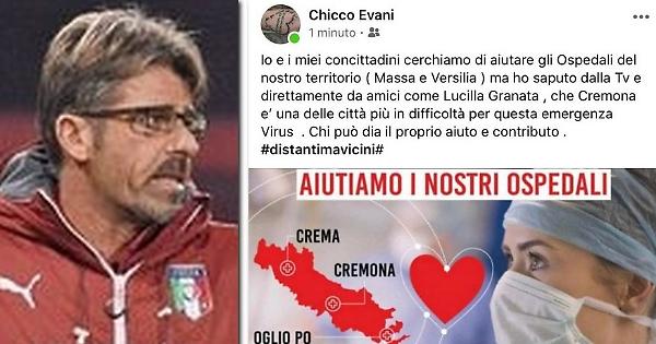 CREMONA (15 marzo 2020) - Alberico Evani, allenatore di calcio ed ex calciatore italiano, di ruolo centrocampista, assistente della Nazionale italiana, con cui fu vicecampione del mondo nel 1994, ha promosso sui suoi profili social l'iniziativa #unitiperlaprovinciadicremona, raccolta fondi a favore degli ospedali in prima linea contro il Coronavirus di Cremona, Crema e Casalmaggiore. "Cremona è una delle città - scrive Evani - più in difficoltà per questa emergenza Virus. Chi può dia il proprio aiuto e contributo".