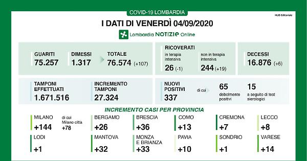 CREMONA (4 settembre 2020) - Nelle ultime 24 ore in provincia di Cremona si segnalano altri sette casi di nuovi positivi al Coronavirus. Sono 6 i decessi in Lombardia.