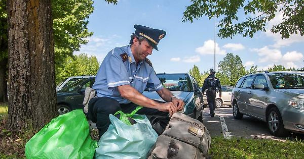 Un agente recupera alcuni borsoni con la mercanzia degli abusivi
