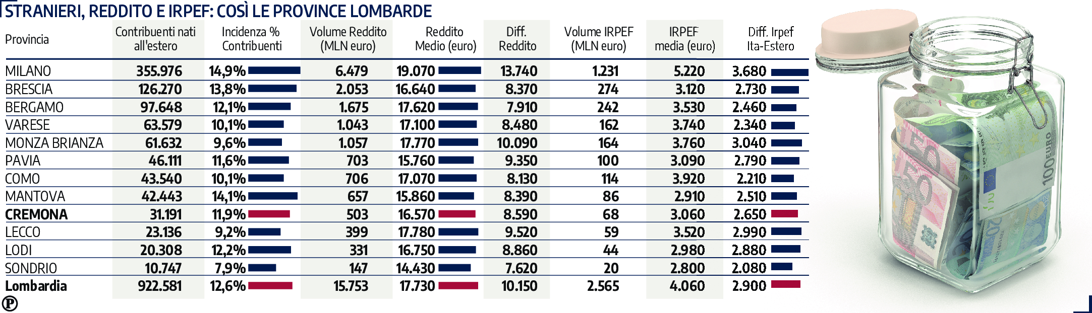 In Lombardia l’incidenza % dei contribuenti stranieri è del 12,6%, dunque Cremona si colloca appena sotto la media regionale. La superano Milano, con il 14,9%, Mantova (14,1%), Brescia (13,8%), Lodi (12,2%) e Bergamo (12,1%).