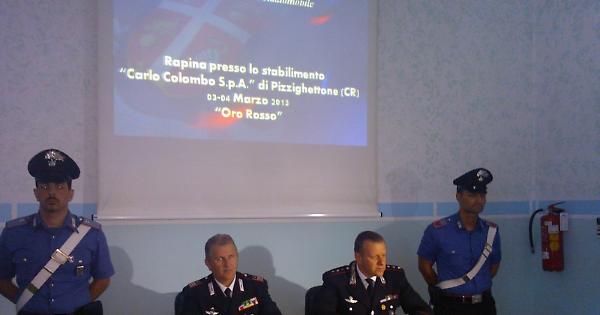 CREMONA - Dagli arresti domiciliari nella sua villa di San Felice del Benaco sul lago di Garda, Francesco Messina (calabrese di 39 anni con svariati precedenti penali) ha organizzato il maxi colpo alla Colata Continua di Pizzighettone nella notte tra il 3 e il 4 marzo con il concorso di tre guardie giurate che hanno simulato una rapina (già arrestate ai primi di giugno) e un autotrasportatore. Ora in carcere soni finiti lo stesso Messina e l’autotrasportatore Antonio Pinto (di Taranto, residente a Misano Gera d’Adda) in seguito allo sviluppo delle indagini effettuate dai carabinieri. I miltari hanno illustrato i dettagli dell'operazione 'Oro rosso' in conferenza stampa.