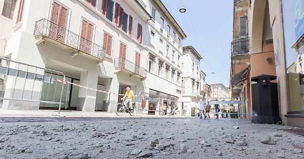 CREMONA - Pericolosa caduta di calcinacci nella mattinata di venerdì 11 luglio in corso Campi a Cremona. Il materiale di è staccato all'altezza del negozio del negozio Golden Point . Tutta l'area è ora transennata.