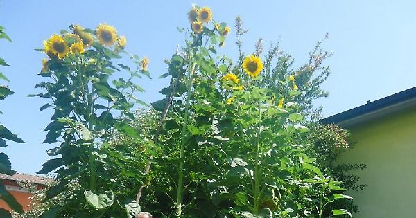Dopo le improvvise folate di vento di giovedì 17 luglio nella notte, il pensionato ha temuto il peggio, ma il girasole ha retto senza spezzarsi. La curiosità è che tutti questi ‘giganti’ ormai nascono spontanei: Malfasi non li semina e non li pianta neanche più. A fine aprile li vede affiorare dalla terra e tre mesi dopo per scrutare la cima deve alzare gli occhi al cielo. Il suo segreto? Sempre lo stesso, senza strane alchimie, tipo vino o altre sostanze. «Solo tanta acqua e tanto letame: i girasoli non hanno bisogno d’altro».